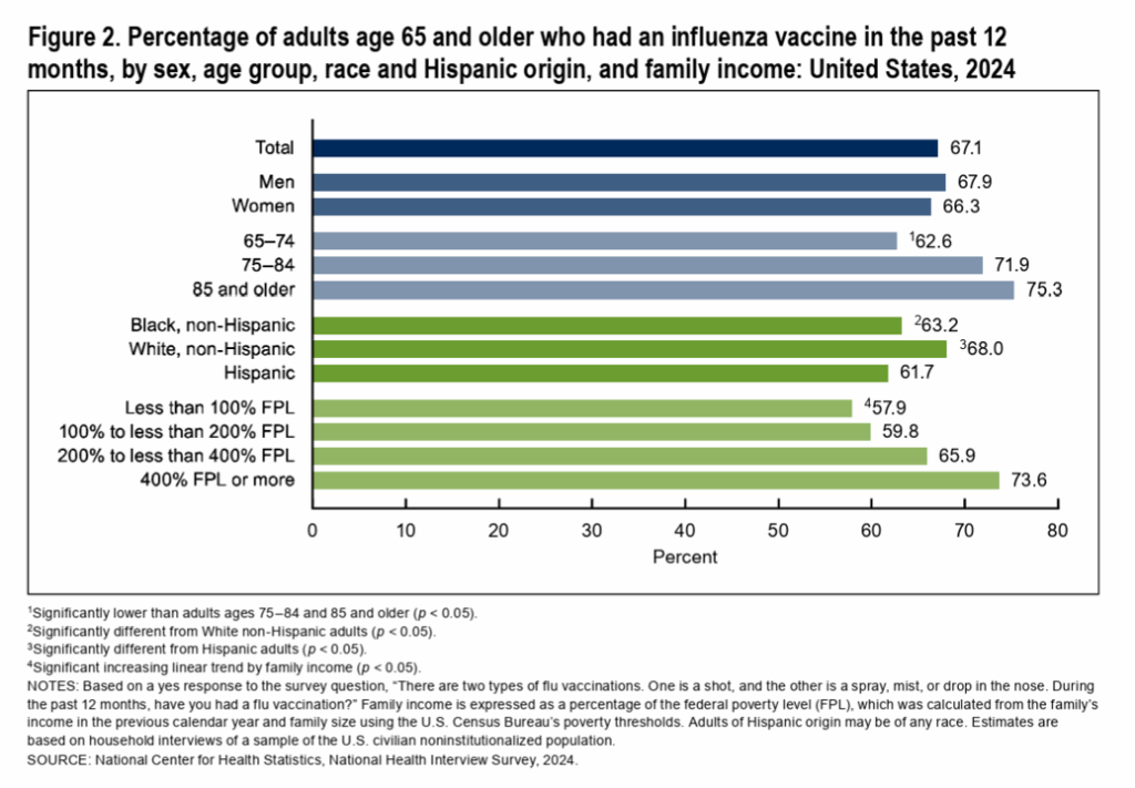 Here are some granular comparisons for influenza vaccination in the past 12 months by older age cohorts, race, and family income in 2024.