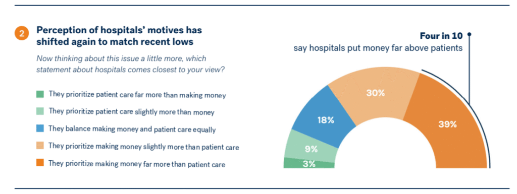 Only 3% of U.S. patients say that hospitals prioritize patient care far more than making money; another 9% say hospitals prioritize making money “slightly more” than patient care.