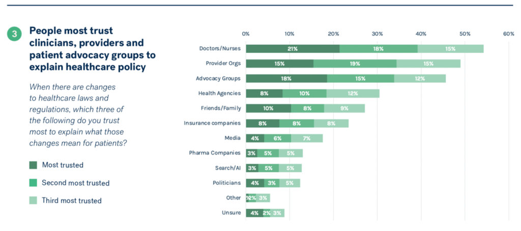 Americans’ rank doctors and nurses above all health care industry stakeholder personae and organizations, shown in the green bar chart — by far, it’s clinicians in the U.S. whom people – patients, consumers, caregivers — trust, above health agencies, friends and family, insurance companies, media, pharma, and to be sure, politicians who rank lowest on this list of trusted healthcare stewards in America.