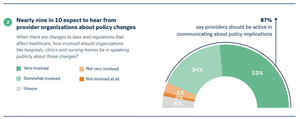 The last graphic from Jarrard’s report supports this recommendation: 9 in 10 U.S. consumers expect to hear from provider organizations about policy changes. The trust lies with the honest and ethical clinicians who are the front-line representing hospitals, clinics and nursing homes — it’s more than time to support our valued and trusted clinicians to partner with patients in communications and care.