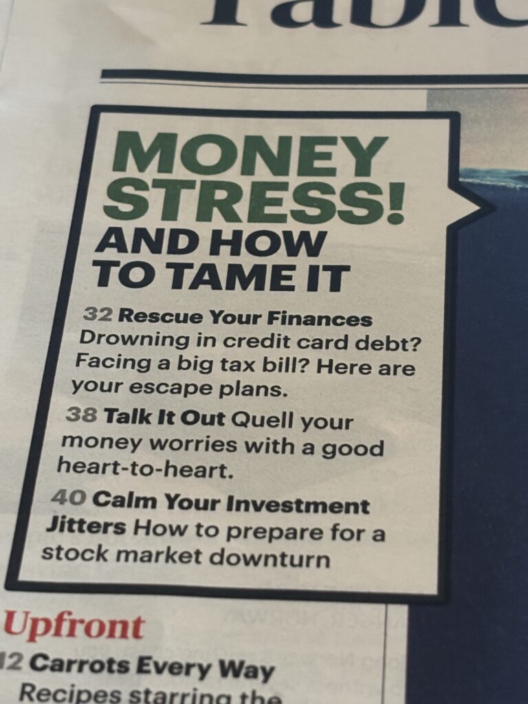 I snapped a photo from my current issue of AARP The Magazine (dated February-March 2006) which features a section on “Money Stress” and how to tame it.