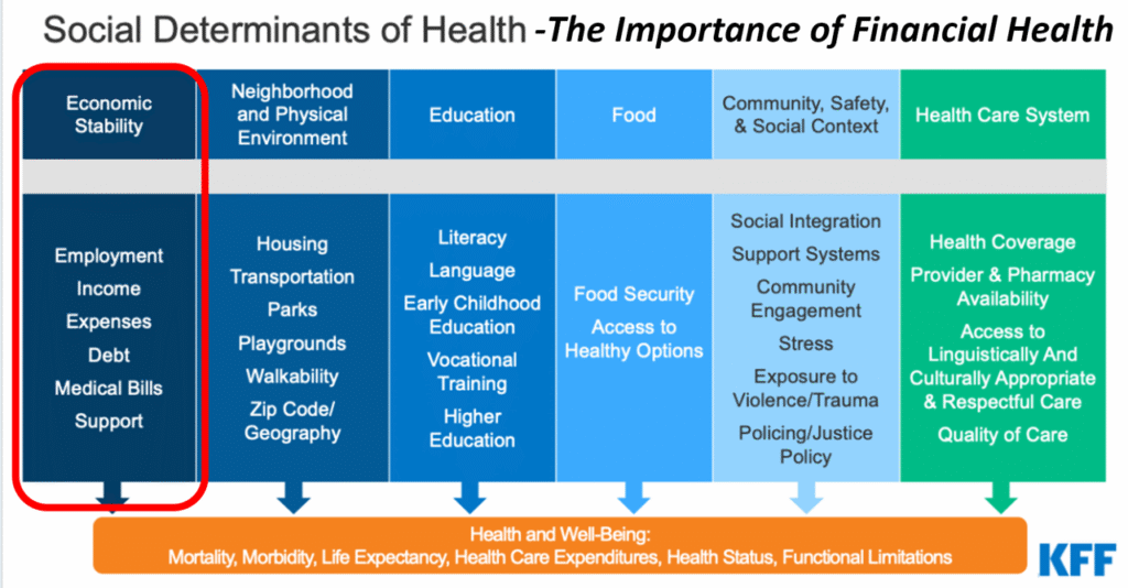 Health Populi’s Hot Points:  Financial well-being — economic stability and security — is one of the key pillars of the social determinants of health (SDoH) as illustrated here on this chart from Kaiser Family Foundation.