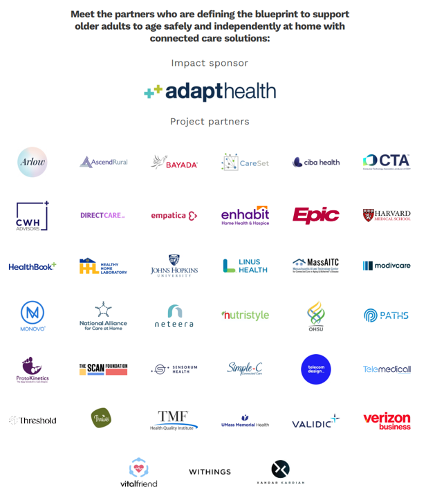 On the aging-longevity front, I’ll finish this up by linking to a recently-announced collaboration between DiMe (the Digital Medicine Society), the Consumer Technology Association, and a host of organizations involved in the aging-at-home ecosystem shown in the graphic at launch announcement – an initiative to “build the digital blueprint for aging in the place of choice.”