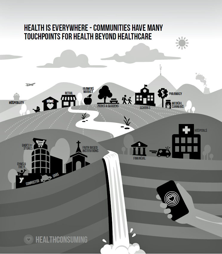 In this drawing of a community’s touchpoints, we see banks, faith-based institutions, grocery stores, farmers’ markets, schools, retail, and indeed hospitality — that is, hotels, airlines, and the travel industry as a vertical market for healthy behavior-support.